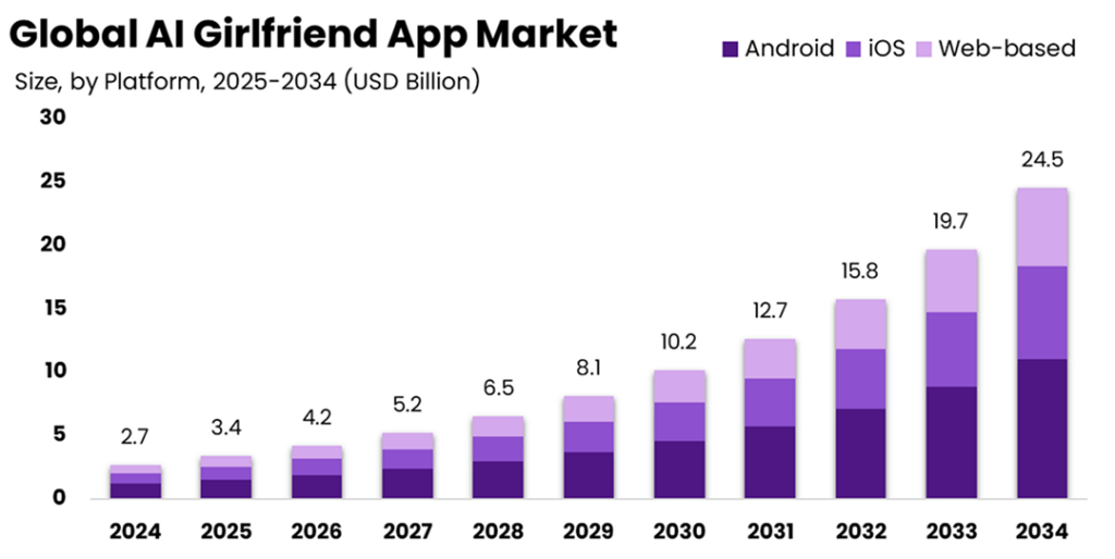 According to research, the AI relationship app market has experienced remarkable expansion, with industry projections indicating growth from $2.7 billion in 2024 to $24.5 billion by 2034 representing a compound annual growth rate of 24.7%. This explosive trajectory reflects genuine user demand: search interest for “AI Girlfriend” platforms surged 525% in a single year, while approximately one in five young adults now express openness to virtual or AI partners.