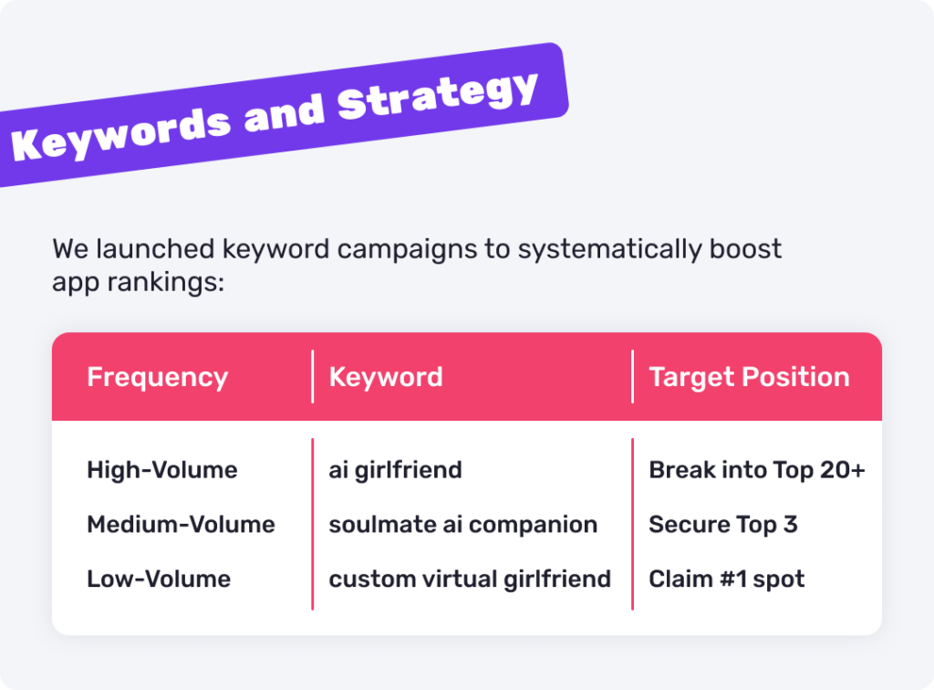 A structured keyword install campaign moved an AI girlfriend app from #142 to Top 20 position in seven days – here’s exactly how we did it.