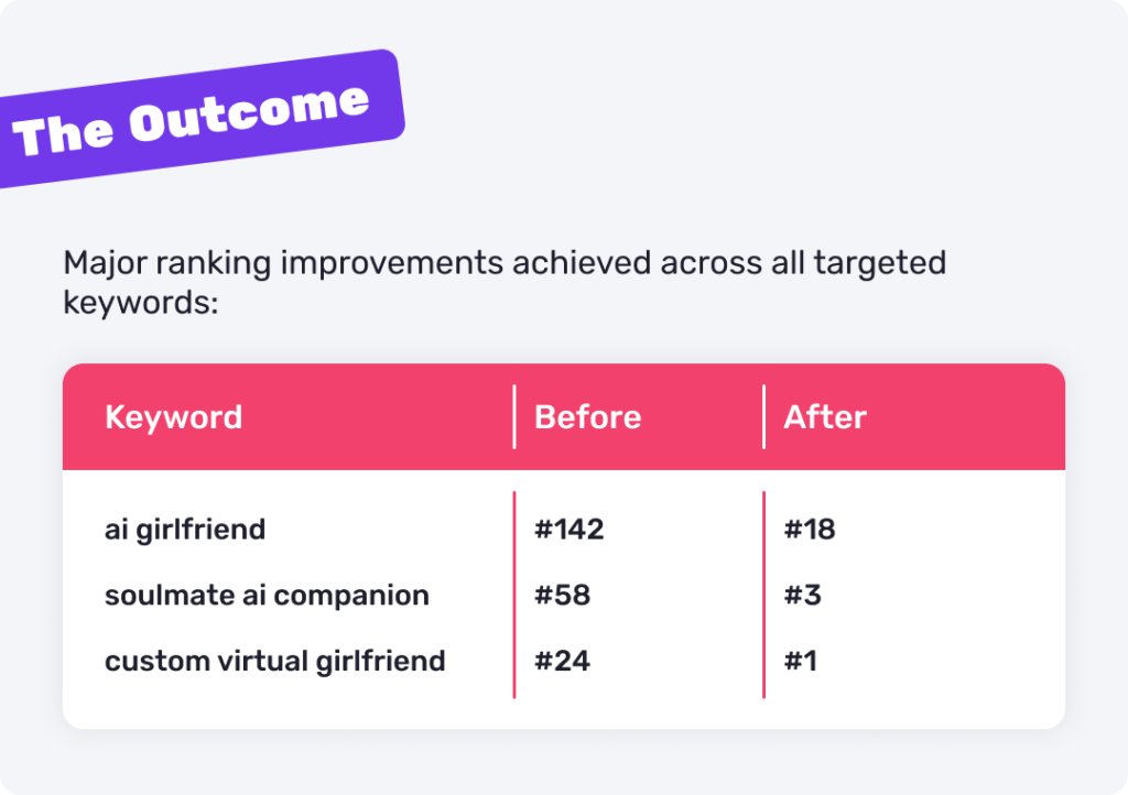 This case study examines how a client’s AI girlfriend app, facing the typical challenges of this saturated category, achieved measurable keyword ranking improvements just in one week. The results included a #1 position for a conversion-focused long-tail keyword, a #3 ranking for a mid-volume search keyword, and movement from #142 to #18 on the category’s most competitive keyword.