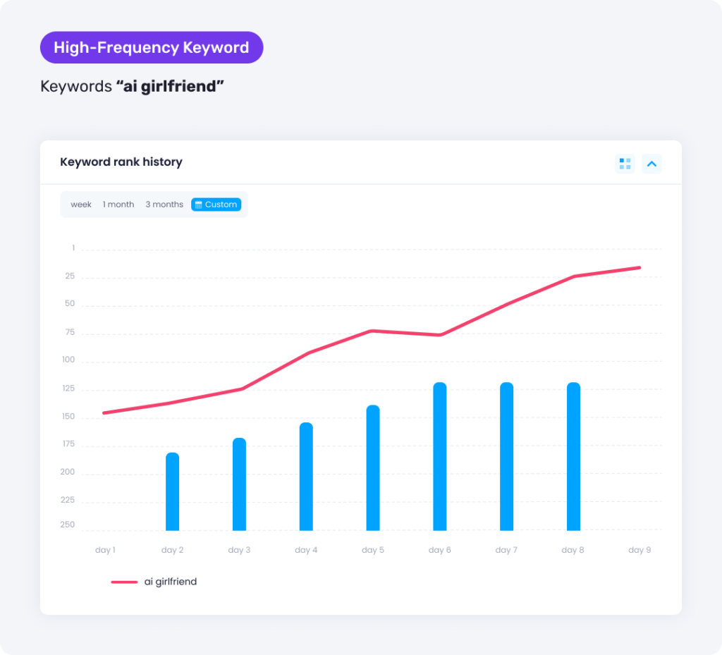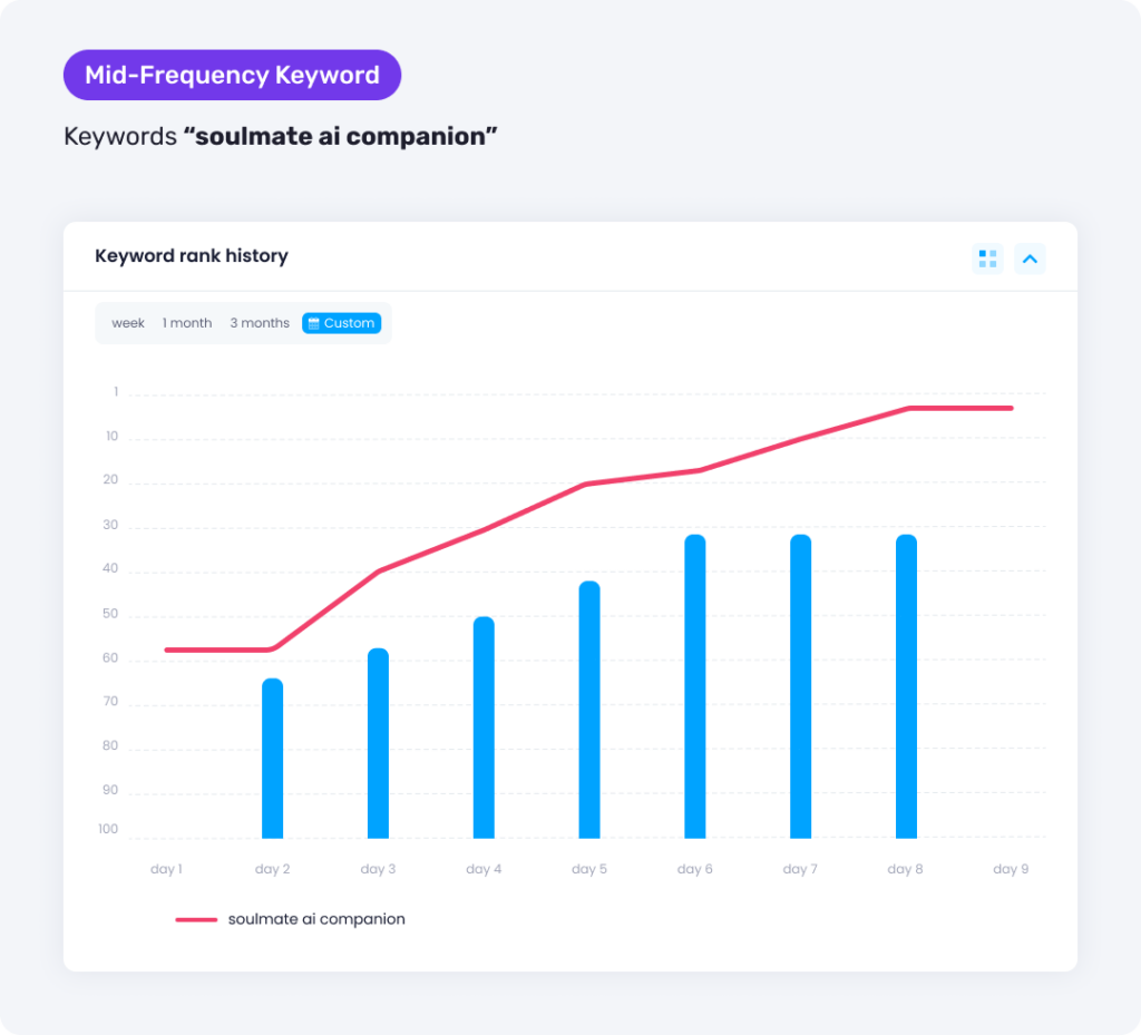 Long-tail keywords convert well because users know exactly what they want. Lower competition made #1 achievable quickly. More importantly, winning here would establish relevance in the virtual companion category, sending trust signals that would help with tougher keywords later.