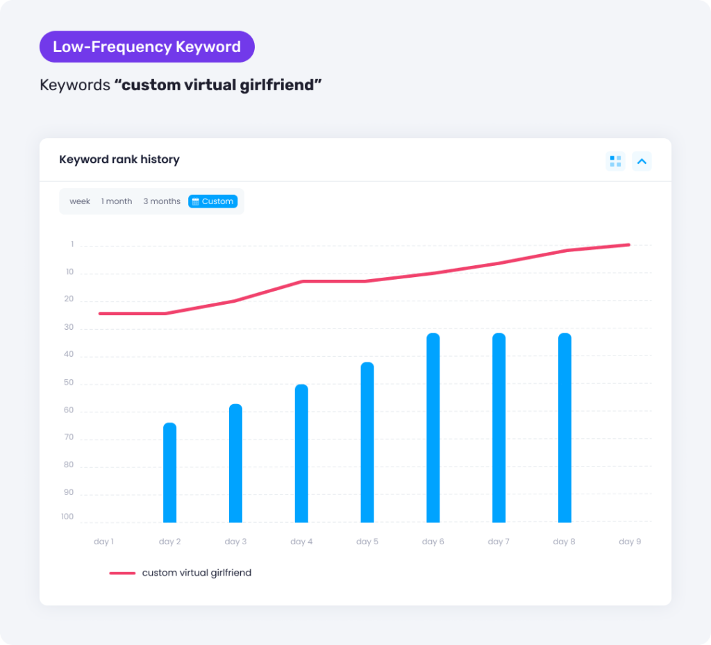 “custom virtual girlfriend” → Rank #1. This ranking won’t flood the app with downloads, but users searching this specific term convert at high rates. They know what they want. And the #1 position established authority. Google’s algorithm now connects this app with virtual companion concepts across related keywords, even ones we didn’t directly promote.