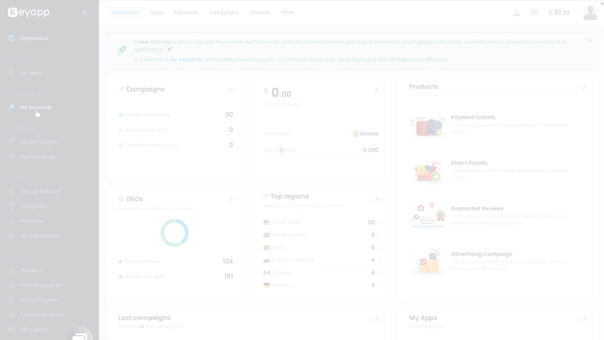 Recommended Keywords is an ASO tool that analyzes all the keywords your app is indexed for in a selected GEO.