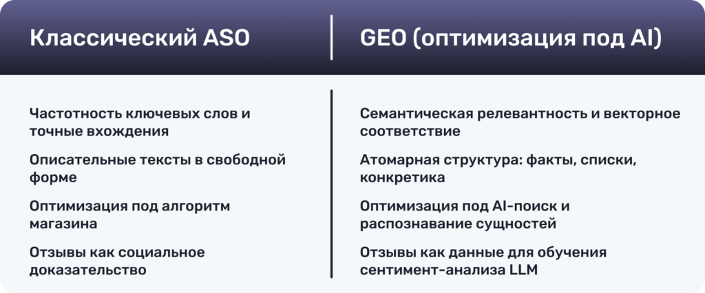 Ключевой принцип: ASO и GEO — это не конкуренты. ASO отвечает за трафик из поиска в магазинах. GEO — за пользователей, которые начинают поиск в AI-ассистентах. Оба канала важны, ни один не вытесняет другой.
